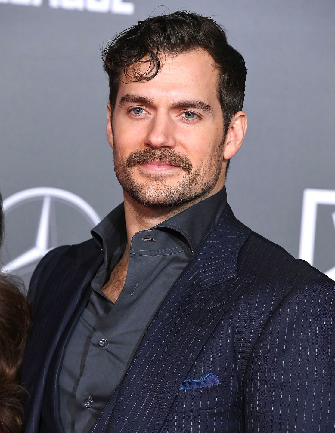 Actor Henry Cavill is shown here looking great in a suit and showing off his manly mustache with facial stubble.