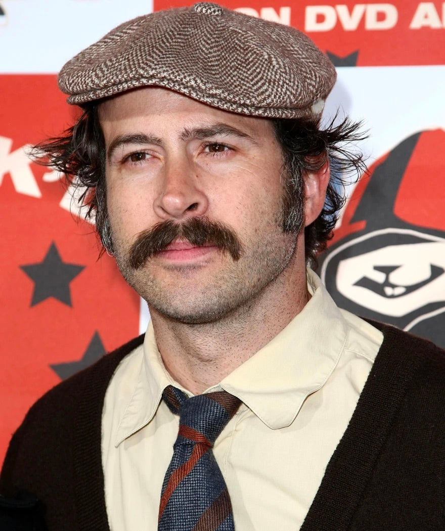 My Name Is Earl actor Jason Lee sports a short stubble beard and long mustache than accentuates the long sideburns.