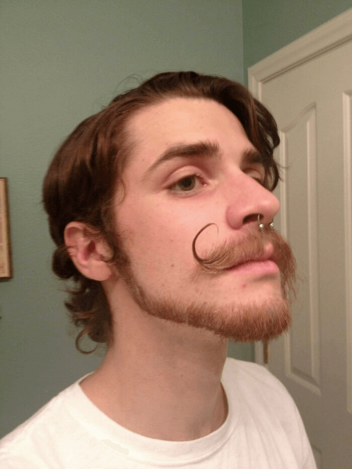 This man has a simple monkey tail beard but with an extra twist: his mustache comes into a point and spirals around.