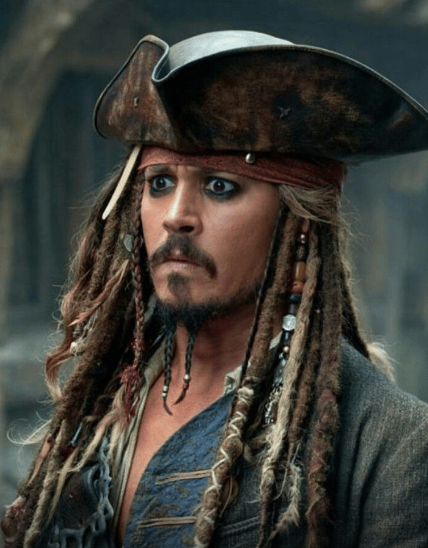 Here’s Johnny Depp in full Jack Sparrow costume, including the famous braided sparrow beard.