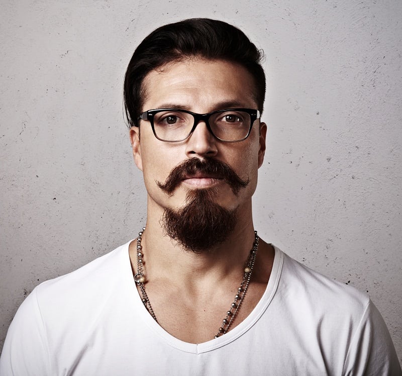 Here you see a thick mustache with an upward curl paired with a goatee.