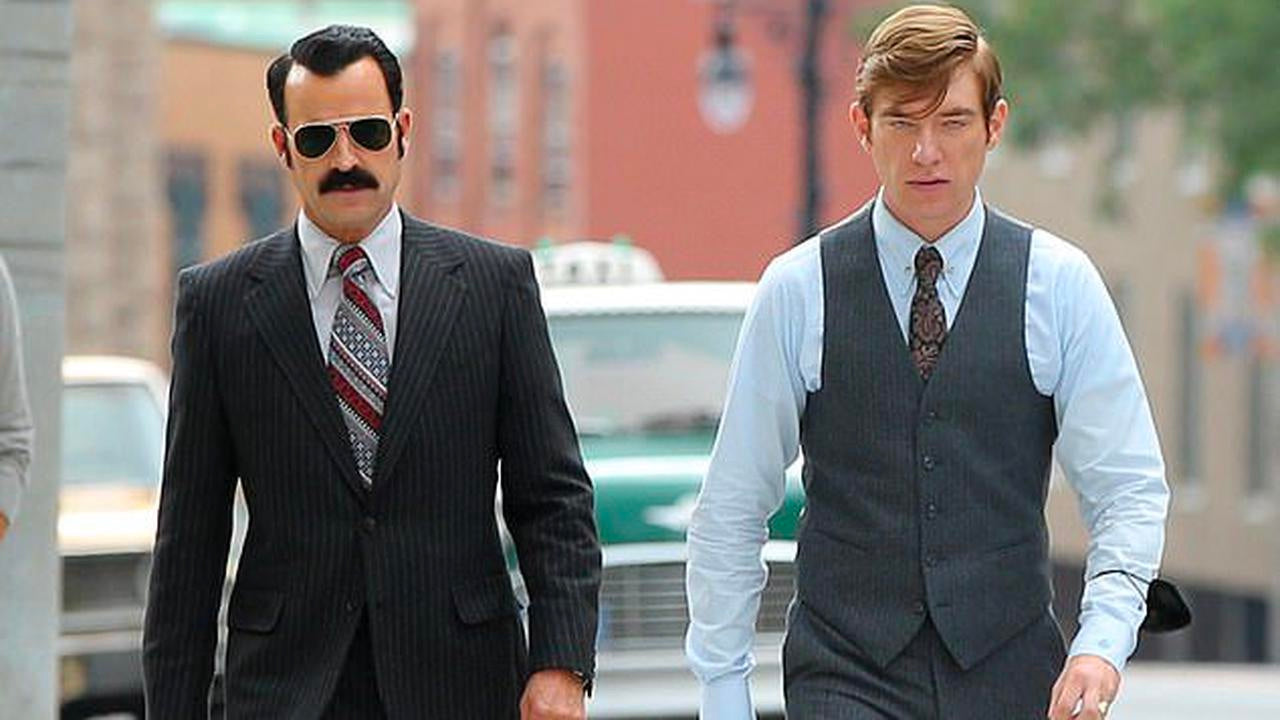 Here we can see Justin Theroux rockin’ a plumber’s mustache with a full suit and tie.