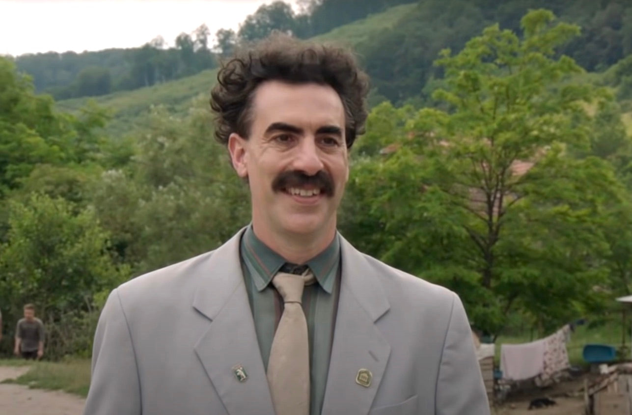 Sacha Cohen portrays his famous character Borat with a thick plumber’s mustache.